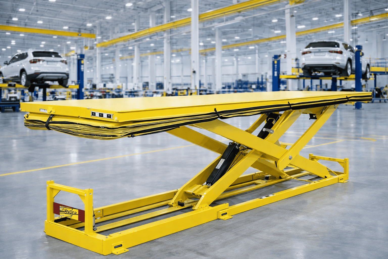 Handling Specialty engineered to order lifts for the beginning and end of a van final assembly process as part of a plant expansion at a major truck manufacturer. At the beginning of the final assembly process, van bodies arrive on a chain conveyor. They are elevated via two mechanically actuated, two-stage scissor lifts situated on either side of the conveyor. This pair of 3,000 lb capacity lifts is synchronized electronically to elevate each van approximately 73″ and then lower it onto the supports of an overhead conveyor. Integrated motion encoders monitor lift motion and height.