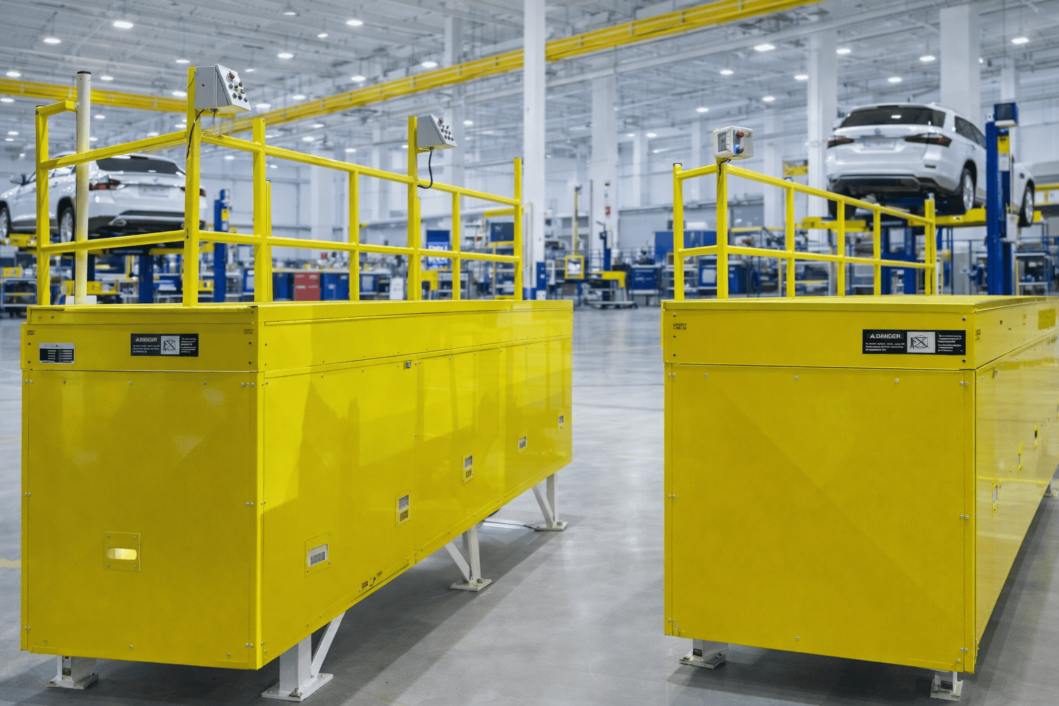These lifts are used to position personnel during the inspection of vehicles in an automotive facility’s paint shop.