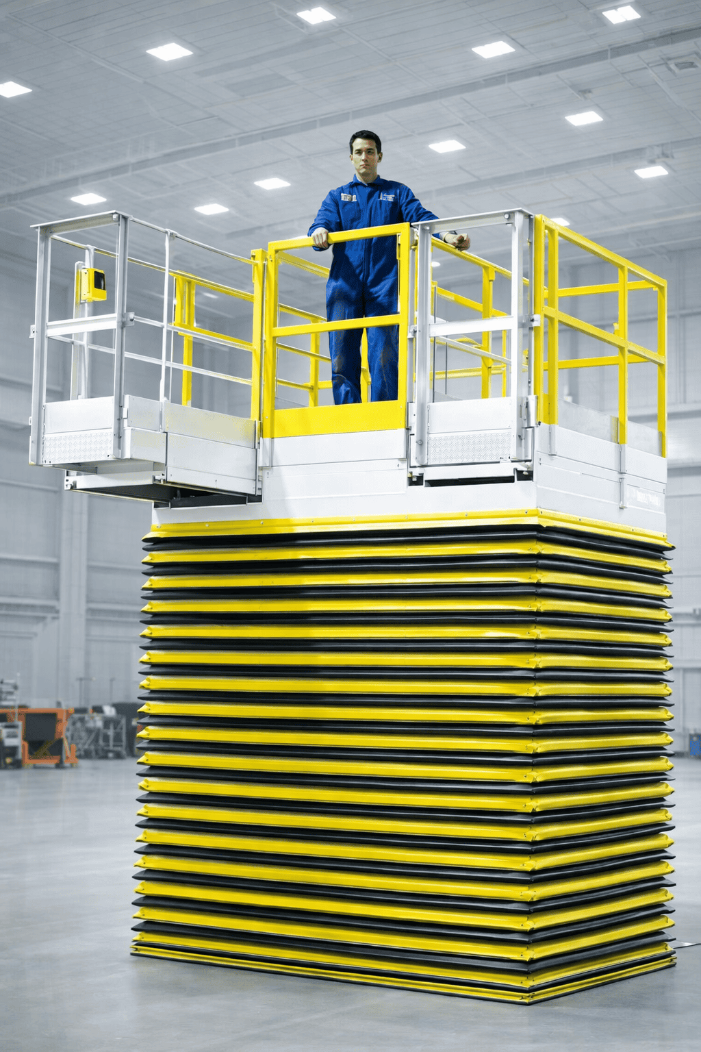 The hydraulically-actuated lift was used to raise workers around the aerospace company’s riveting machine — which was used in the manufacture of airplane wings — to enable technicians to service it quickly and safely.
