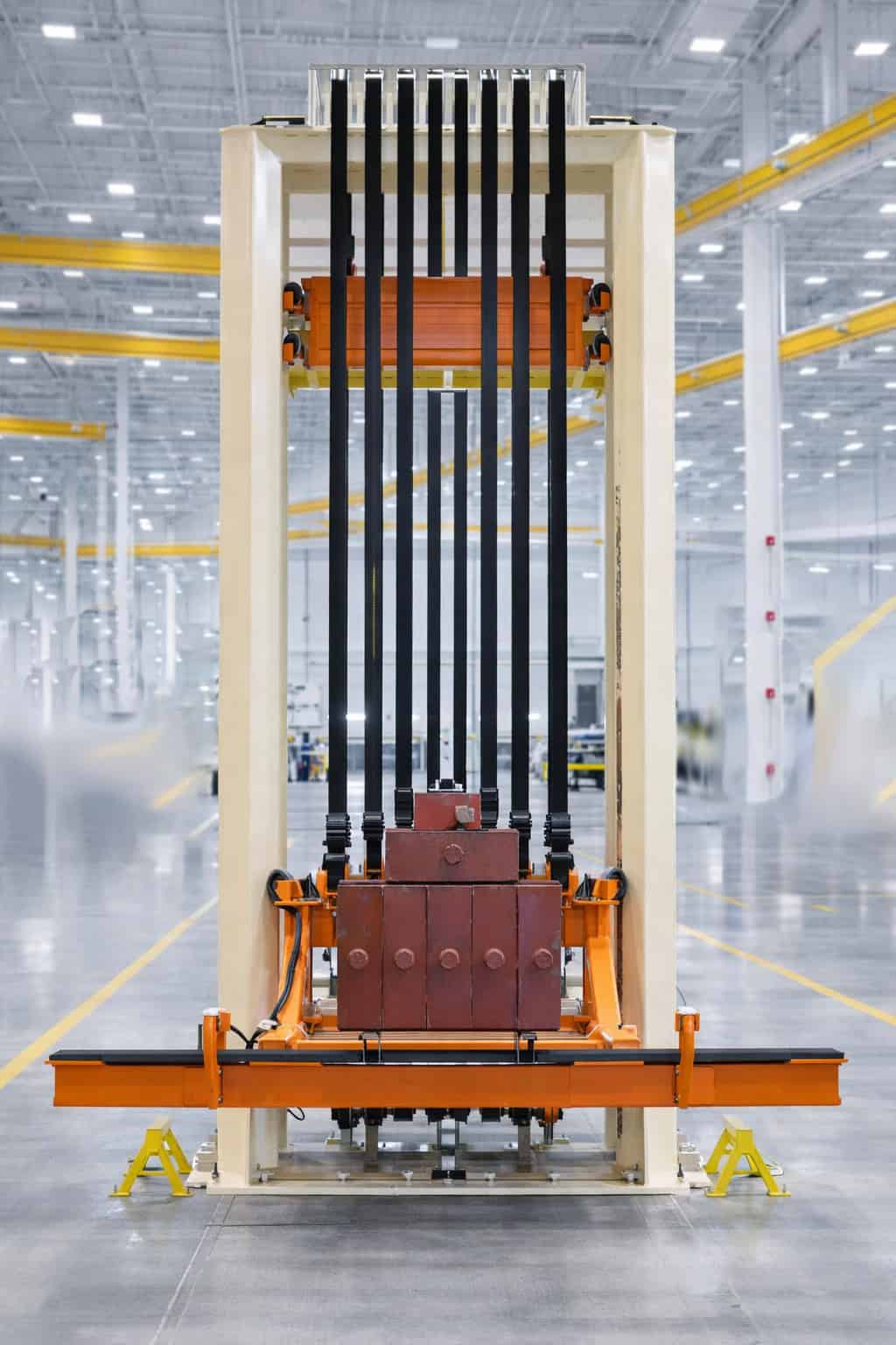 Designed with redundant safety systems and multiple belts, this vertical drop lifter was engineered to reduce deflection, ensure the level and accurate positioning, support cantilevered loads of up to 3,800 lbs, and offer high-duty cycles. The mast structure supports the lift carriage, while the drive train employs a belt equalization system, operated by an electro-mechanical motor with lock-position actuators. The vertical drop lifter also offers an OSHA-compliant upper-level personnel access platform and floor-mounted devices for ease of access during planned maintenance.