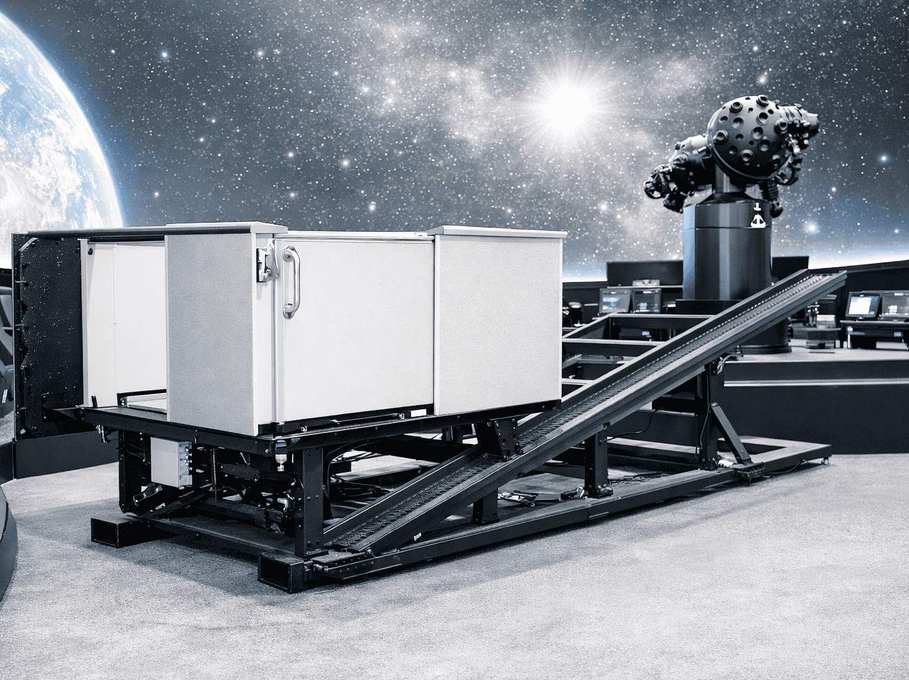 Handling Specialty custom engineered and designed a ramped system to transport seated visitors into a theatrical show inside a sphere at a major tourist attraction in Chicago. The lift could carry 12 people and was operated by staff using a panel inside the booth.