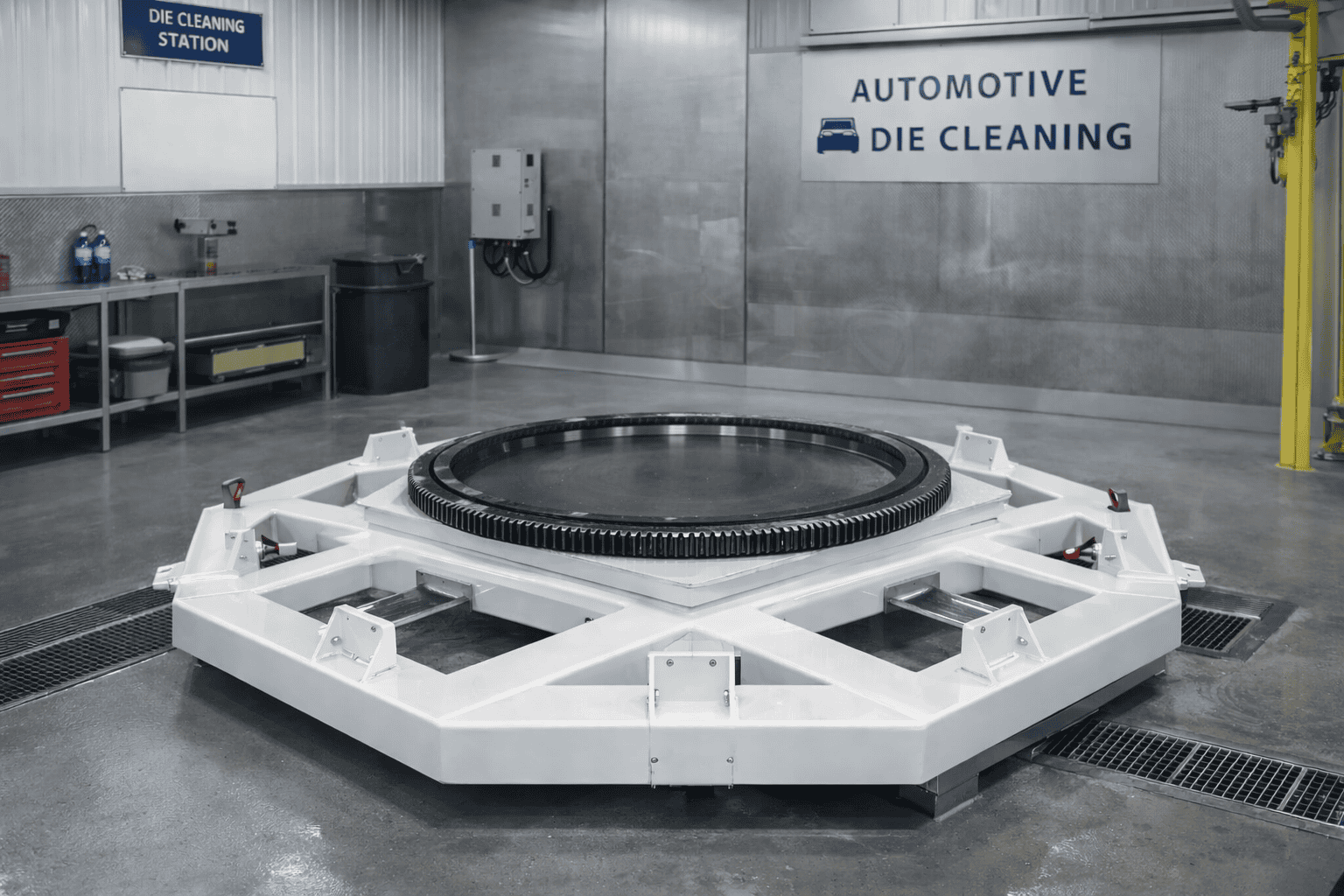 Handling Specialty custom engineered and manufactured a 20,000 lb capacity rotator to be used by an aluminum casting facility for the automotive industry as part of a robotic process for the cleaning of 4,500 lb core dies with dry ice. In addition to handling the weight of the dies, the rotator top also must support 2,000 lbs in tooling.