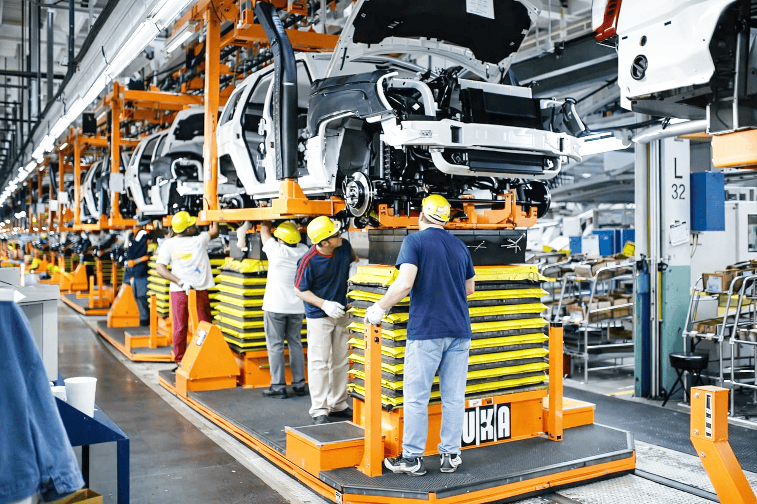 The front and rear axles are loaded onto the lifts manually using overhead assist devices. The axles travel around the system in the lowered position and enter a station where a synchronized overhead system brings in the vehicle body. Operators then raise the lift to make contact with springs compressing them 2” to 3”. At that point, the operator can then secure the axles to the vehicle.