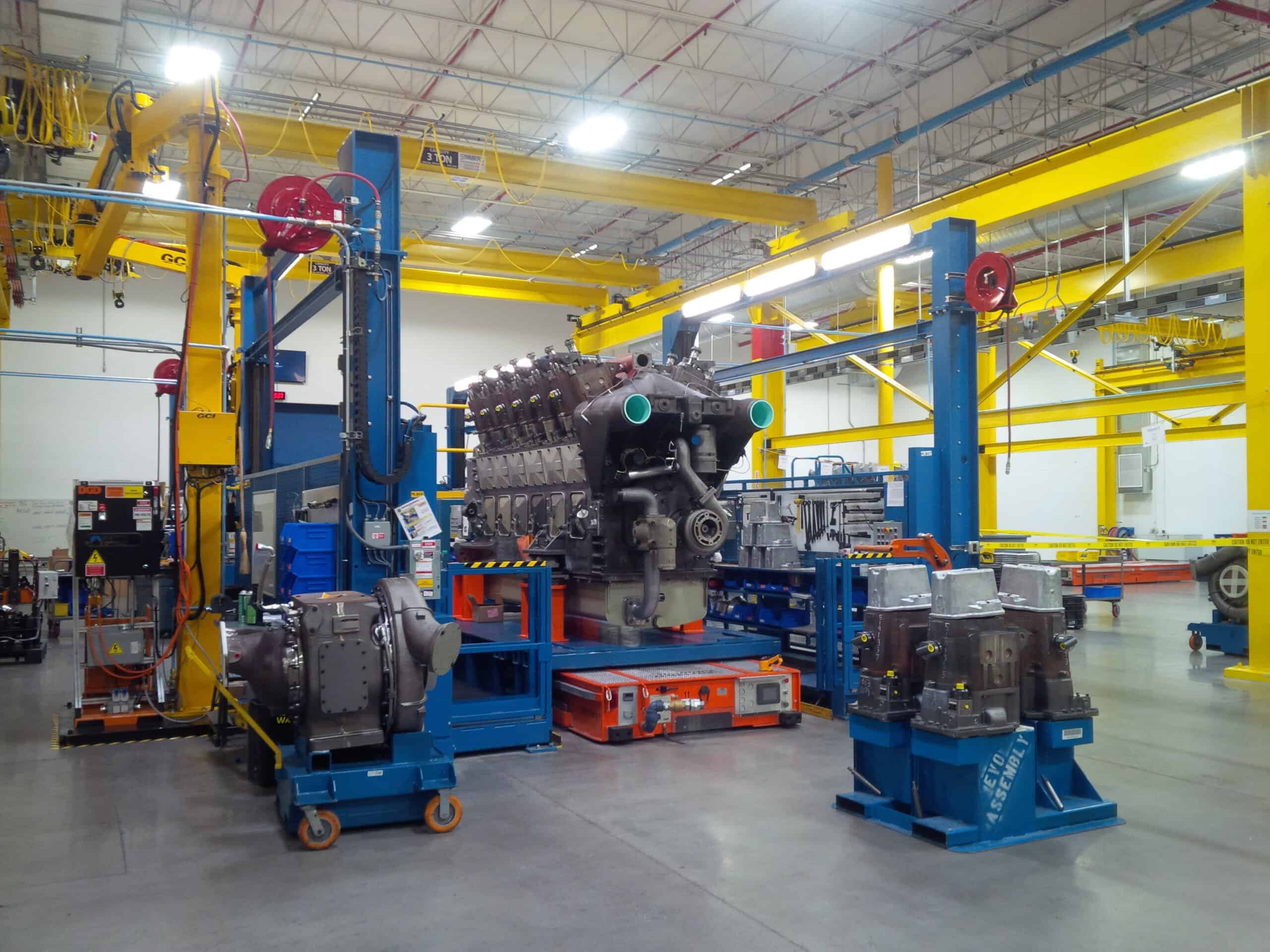 Manually Guided Vehicles or battery-powered transfer carts have also been engineered to transport large engines and turbines through the assembly process with specialized tooling to accommodate multiple sizes of product. Massive four-post lifts raise the product for inspection before they are moved out of the manufacturing facility.