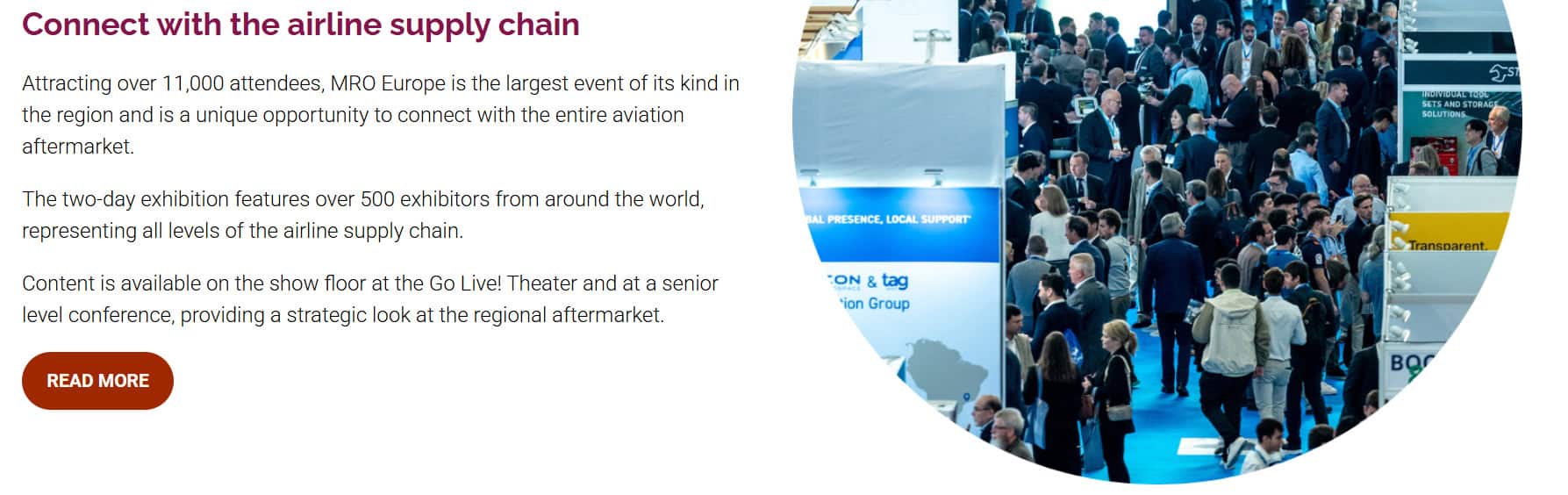 Attracting over 11,000 attendees, MRO Europe is the largest event of its kind in the region and is a unique opportunity to connect with the entire aviation aftermarket. The two-day exhibition features over 500 exhibitors from around the world, representing all levels of the airline supply chain.