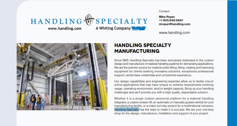 The Ontario Aerospace Counsel has been a good partner with Handling Specialty, and we have appeared in their directory for many years now. Supporting the aerospace industry in Ontario and around the world is an important part of Handling’s daily endeavours. We build equipment like engine lifts, rotators, paint booth personnel systems, engine dress bays, wind tunnel turntables, pit-mounted engine assembly lifts, inverted belt lifts, and any other custom piece of material handling equipment the client and our extensive engineering department can dream up.